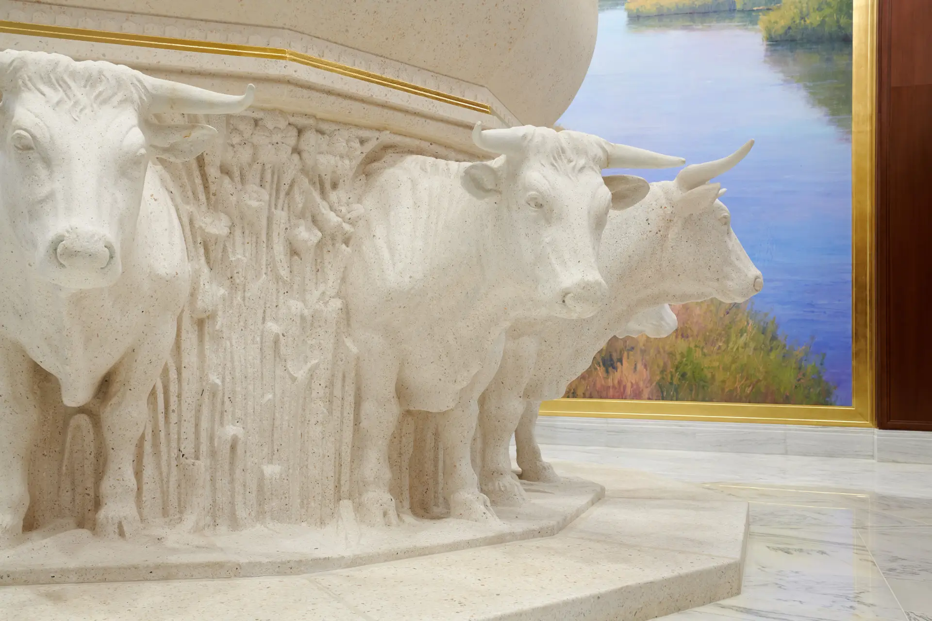 Les fonts baptismaux du temple de Washington DC sont épaulés par des bœufs, représentant les 12 tribus d'Israël, en terrazzo coulé. ©2022 par Intellectual Reserve, Inc. Tous droits réservés.