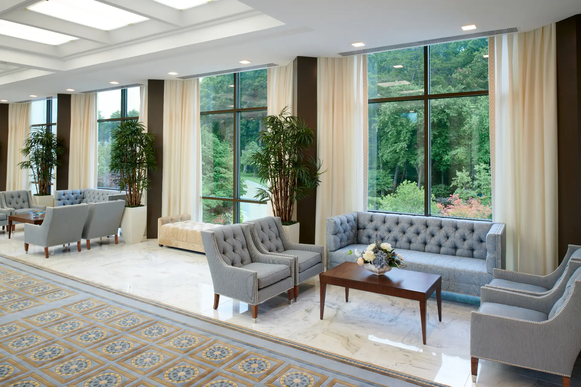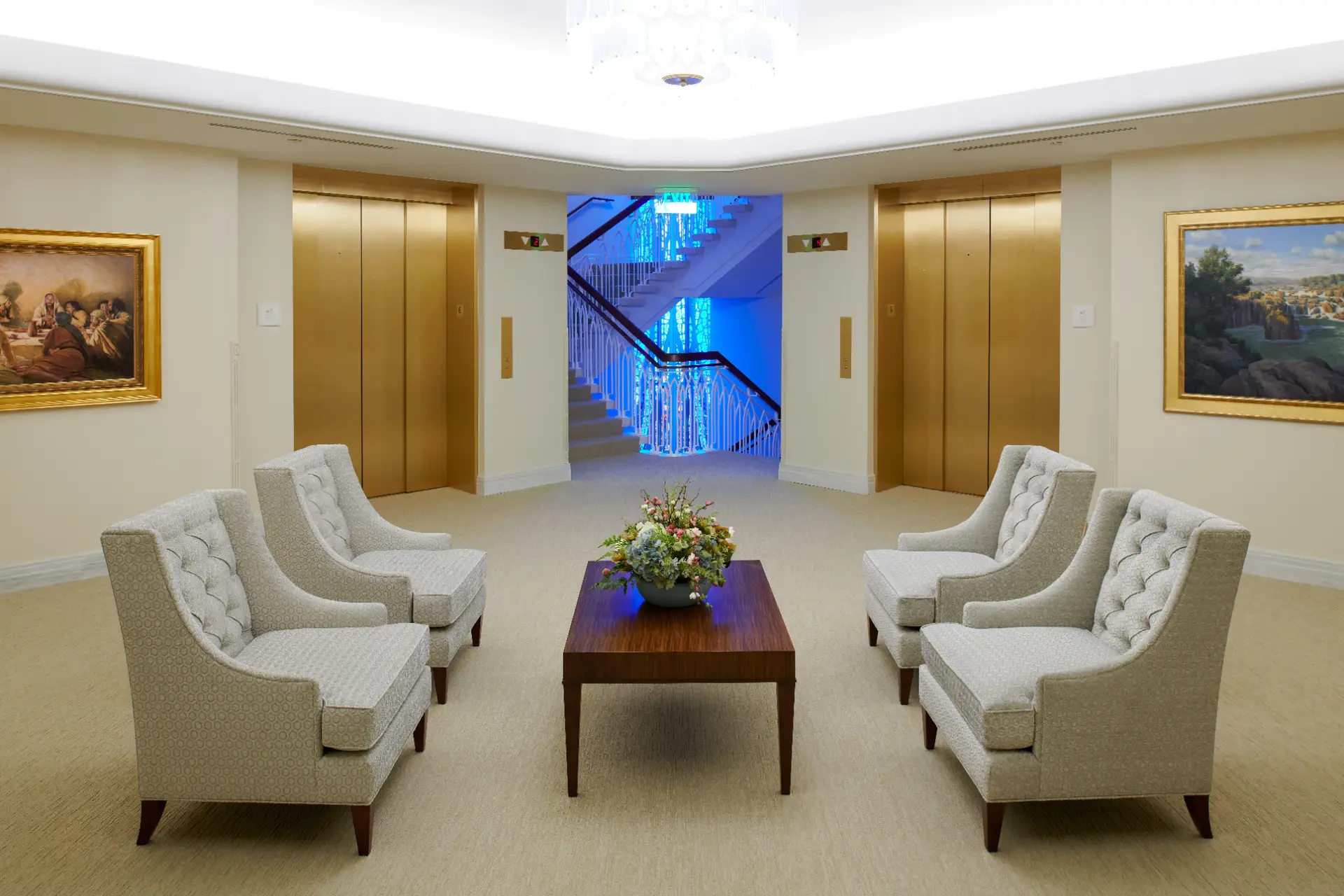 Un coin salon à l'intérieur du temple de Washington DC, avec le grand escalier et le mur de vitraux en arrière-plan. ©2022 par Intellectual Reserve, Inc. Tous droits réservés.