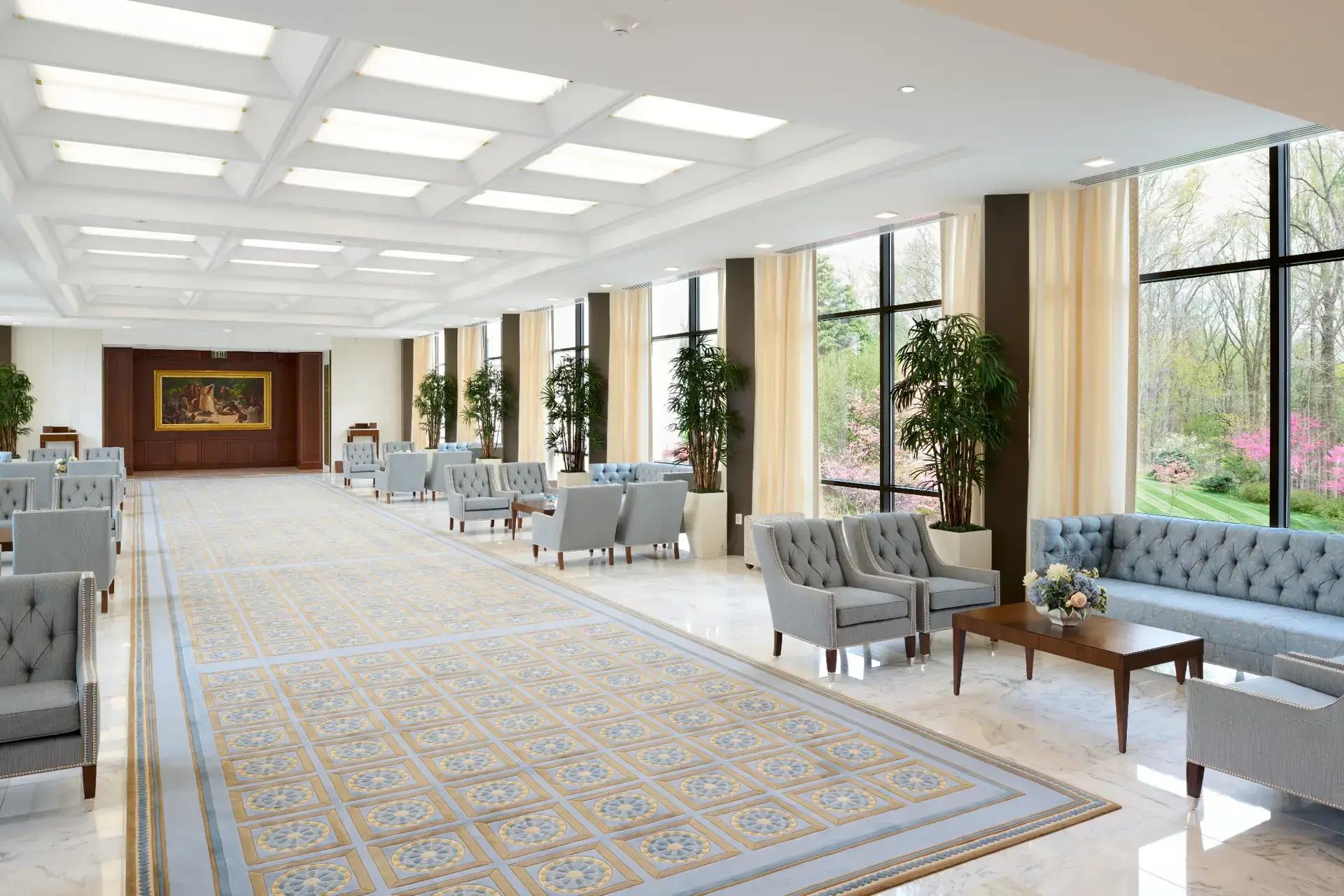 Un mobilier au design moderne accompagne un tapis à motifs géométriques personnalisé et un sol en marbre blanc dans le pont vitré du temple de Washington DC, juillet 2021. Traverser le pont de la réception au temple lui-même suggère un départ des soucis du monde vers la tranquillité céleste . ©2022 par Intellectual Reserve, Inc. Tous droits réservés.