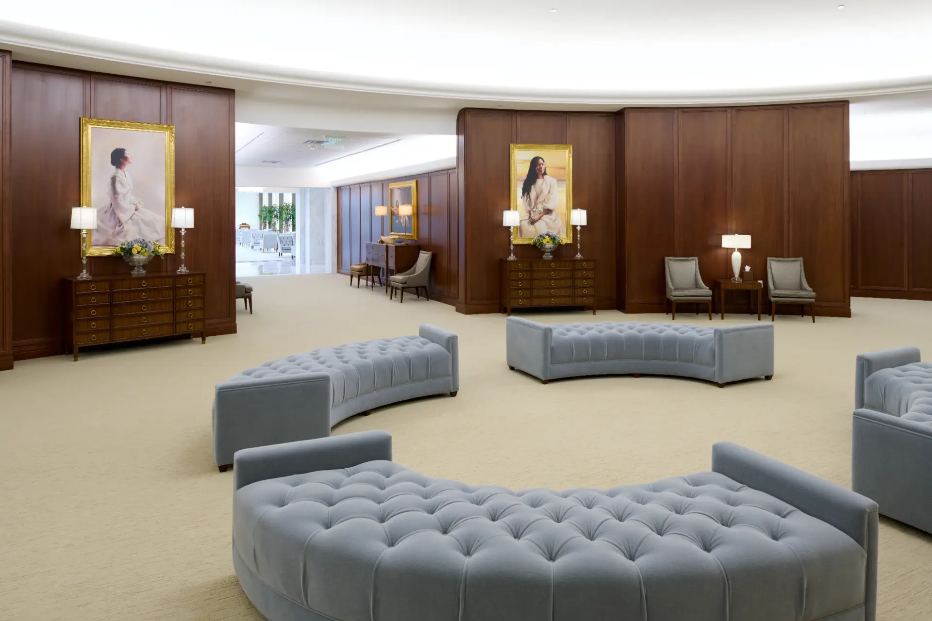Entrez dans la rotonde ovale en forme de dôme du temple de Washington DC. La rotonde est ornée de bois dur d'anègre africain et d'érable et d'un mobilier moderne du milieu du siècle, avril 2022. ©2022 Intellectual Reserve, Inc. Tous droits réservés.