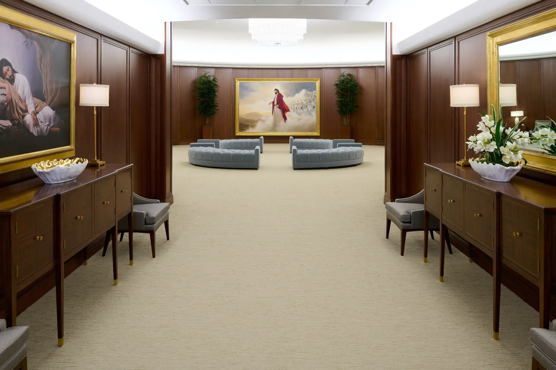La chambre des mariées à l'intérieur du temple de Washington DC comprend un tapis à motifs de fleurs de cerisier, des appliques en cristal et un lustre, juillet 2021. ©2022 par Intellectual Reserve, Inc. Tous droits réservés.