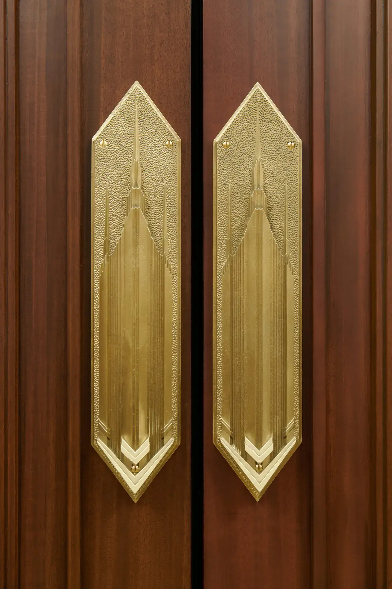 Les portes de la salle céleste à l'intérieur du temple rénové de Washington DC comportent des écussons en laiton gravés à l'image du temple et en forme de l'empreinte du temple. ©2022 par Intellectual Reserve, Inc. Tous droits réservés.